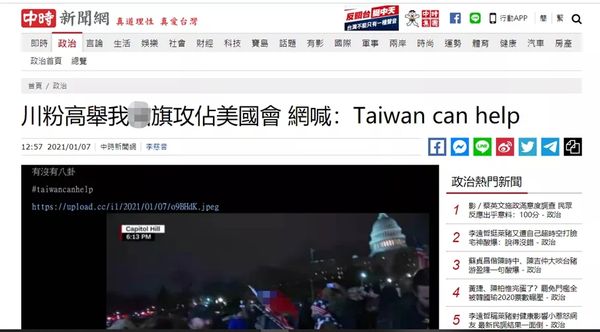 一直以来,台湾当局都喜欢以“Taiwan Can Help(台湾可以帮忙)”的口号在国际上刷存在感。但就在1月7日大量特朗普支持者冲击美国国会这则新闻中,台湾网民们又把这句口号玩出了“新高度”。