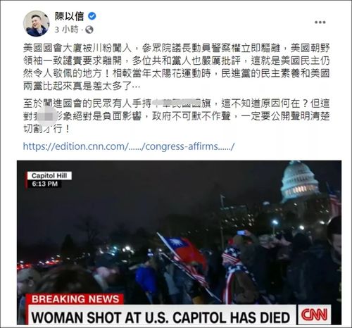 相比网民的调侃,国民党“立委”陈以信对这事的态度就显得过于“一本正经”了。面对美国出现如此严重的混乱,陈以信在网络推文中却夸耀“美国民主仍让人敬佩”,随后借机嘲讽了民进党“民主素养差太多”。