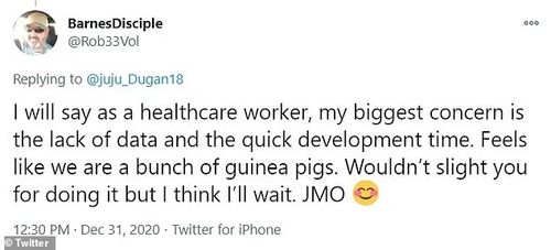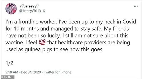 有医护人员在推特上写道:“我最大的关切是缺乏数据,以及疫苗研发时间太短,我们成了小白鼠。我需要再等等。”