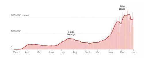 据约翰霍普金斯大学的统计显示,2021年第一天,美国新增病例16万,死亡病例2051人。好消息是,这个数字比前几天有所下降;坏消息是,专家预计在新年假期过后,美国新冠病例将再次攀升。原因之一是民众在假期出行增加,在12月底美国机场每天客流量超过一百万人;原因之二是天气转冷让病毒更易传播。