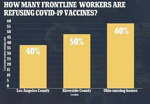 但是一线的医护人员真的愿意接种疫苗吗?调查显示,在加州的河滨郡,接近一半的医疗工作者不愿意接种疫苗;在得州的一家医院也有一半的医护人员拒接接种疫苗;在俄亥俄州的一个护理中心,六成员工不愿意接种,在洛杉矶的一线医护人员也有高达四成拒绝了疫苗。