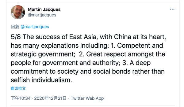 “中国的政府和人民之间有一定程度的和谐、亲近,有协作、也有理解,政府与社会之间也是,而在西方,则完全不是这样。看下各国疫情的情况,中国及其他受儒家文化影响的国家都取得了不同程度的成功。而西方世界,除了新西兰,都应对得很差劲。”