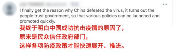 “我终于明白中国成功抗击疫情的原因了,原来是民众信任政府部门,这样各项防疫政策才能快速展开、推进。”