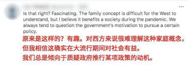 “原来是这样的?有趣。对西方来说很难理解这种家庭概念,但我相信这确实在大流行期间对社会有益。我们总是倾向于质疑政府推行某项政策的动机。”