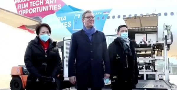 ▲塞尔维亚总统武契奇1月16日迎接首批中国疫苗(中国国际电视台报道截图)