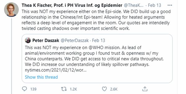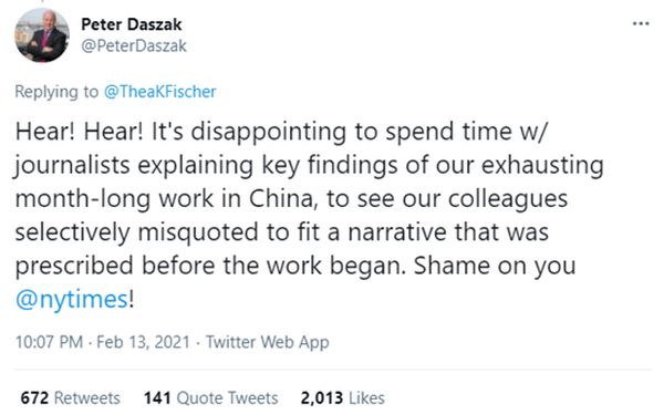 当时,西方媒体这一卑鄙的操作直接引起了世卫组织国际专家团队中多名专家的抗议。比如英国的病毒专家Peter Daszak和丹麦的流行病学专家Thea Fischer就表示他们在武汉与中方的合作很顺利,并没有出现西方媒体所描述的那种情况。