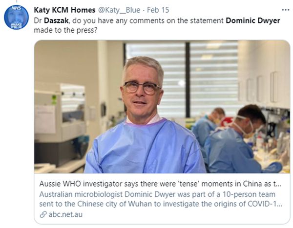 然而,由于当时被歪曲的Dominic Dwyer并没有自己出面澄清此事,所以也有一些反华分子和挑事者就“心存侥幸”地宣称Peter Daszak等其他与Dominic Dwyer共同在中国工作了数周、天天在一起开会的专家,代表不了这位澳籍专家。