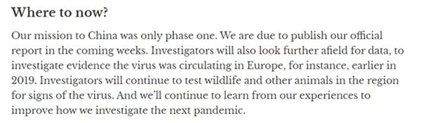 最后,Dominic Dwyer还表示此次的中国之行只是他们“第一阶段”的工作,接下来国际专家团队还会在其他地方对新冠病毒开展溯源,比如对那些病毒在2019年早些时候出现在欧洲的证据进行调查,以及对相关地区的野生动物和其他动物继续开展调查,寻找病毒的蛛丝马迹。