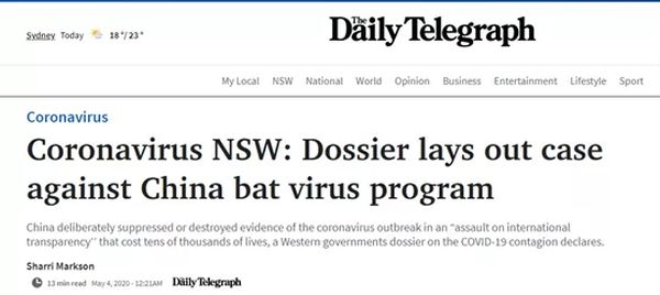 (图为去年默多克“新闻集团”旗下的《每日电讯报》编造的一篇新冠病毒是武汉实验室泄露的谣言,该报称这个消息是美国情报部门提供的)