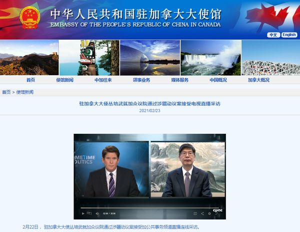 2月22日, 驻加拿大大使丛培武就加众议院通过涉疆动议案接受加公共事务频道直播连线采访。