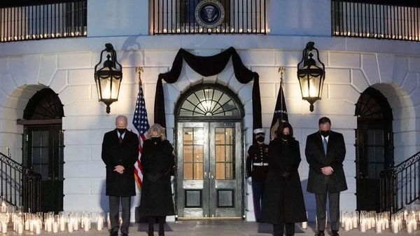 ▲美国东部时间2月22日,拜登夫妇和哈里斯夫妇默哀一分钟,白宫降半旗,悼念50万因感染新冠病毒死亡的美国人。
