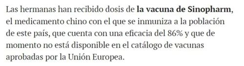 报道称,今年2月,两姐妹前往阿联酋阿布扎比看望她们的父亲,并在停留的两周时间内接种了中国的新冠疫苗。Elena和Cristina虽然已经57岁和55岁,但因为她们不是从事高危职业人群,所以不属于任何优先接种群体,需要再等几个月才能在西班牙本土接种疫苗。