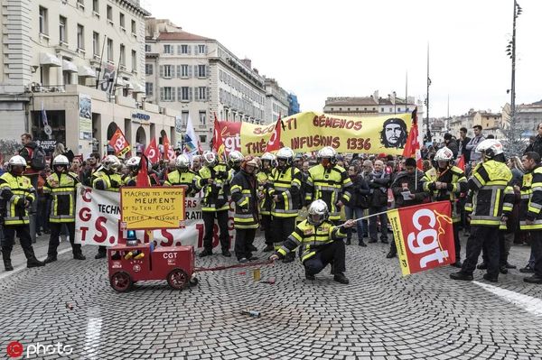 当地时间2019年12月5日,因对马克龙的养老金改革计划不满,法国公交、能源、教育等领域从业人员参与罢工。马赛的消防员也加入示威队伍,身后横着印有切格瓦拉头像的标语(图源:东方IC)
