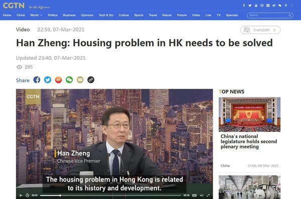 中国国际电视台(CGTN)7日发布了韩正与香港代表团会面的片段。在讲话中,韩正提到了完善香港特区选举制度、香港金融中心发展、香港住房问题等外界关注的议题。