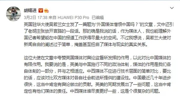 此前报道:“外国媒体憎恨中国吗?”英驻华大使发文,胡锡进接招