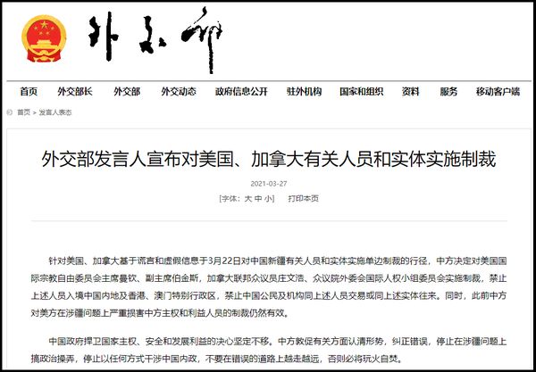 中国外交部3月27日宣布对美国、加拿大的相关人和机构进行制裁,被制裁者包括美国“国际宗教自由委员会”主席曼钦和加拿大议员庄文浩等。他们都是美加反新疆运动的推动者。