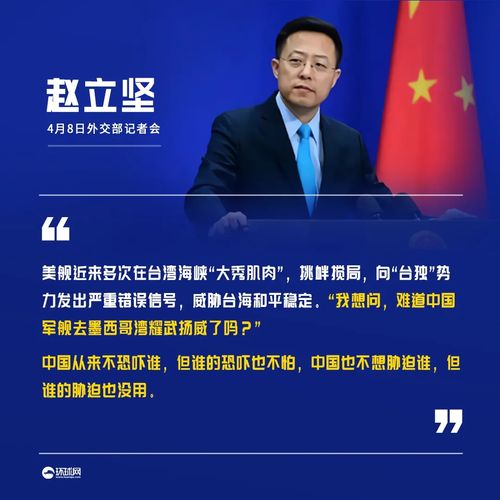 赵立坚在当天举行的例行记者会上表示,第一,在台湾问题上,到底是谁在恐吓和胁迫?世界上只有一个中国,台湾是中国领土不可分割的一部分,中华人民共和国政府是代表全中国的唯一合法政府,这是国际社会公认的基本事实。一个中国原则是中美关系的政治基础,也是美方在中美签署的联合公报中明确向中方做出的承诺,是不可逾越的红线。美舰近来多次在台湾海峡“大秀肌肉”,挑衅搅局,向“台独”势力发出严重错误信号,威胁台海和平稳定。“我想问,难道中国军舰去墨西哥湾耀武扬威了吗?”