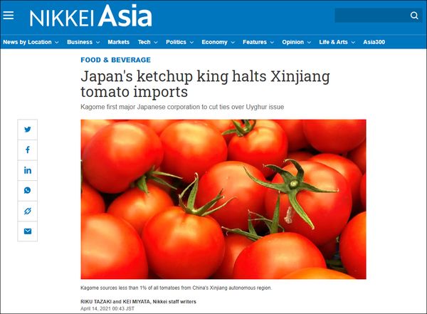 据日媒《日经亚洲》(Nikkei Asia)4月14日报道,日本的主要番茄酱生产商可果美(Kagome)已停止从新疆进口番茄。《朝日新闻》援引该公司宣传部门的话称,它们认为目前对新疆“人权问题”的担忧正不断提升,同时还考虑到了品质、采购稳定性、成本等方面的因素。