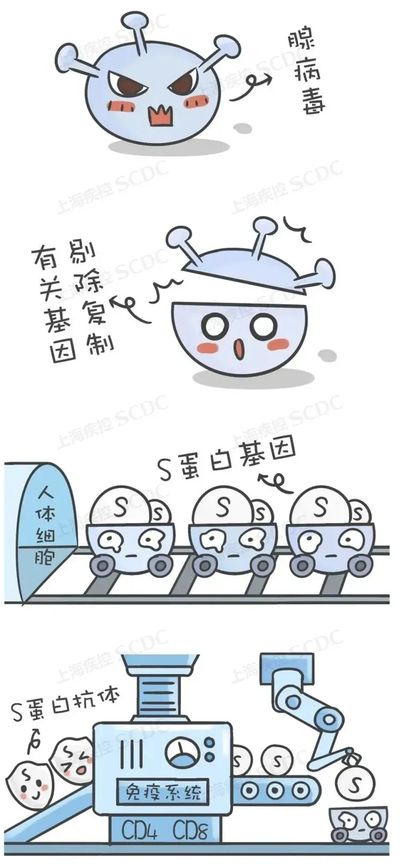 首先是技术原理不同,这个疫苗的腺病毒载体,是剔除了腺病毒(这里用的是人5型腺病毒,Ad5)中与复制相关的基因,这样病毒就不会在人体中复制。再把新冠病毒刺突蛋白(S 蛋白)的基因插入进去。这个新插入基因让重新组装的病毒进入人体后,可以在体内复制出新冠病毒刺突蛋白,我们的免疫系统发现刺突蛋白后会启动免疫应答,同时记住它的样子,下次碰到真的新冠病毒就会马上做出反应清除它们。