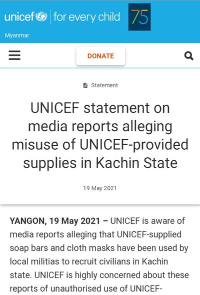 近日,多家缅甸社交媒体报道,克钦邦当局将联合国儿童基金援助的肥皂和口罩等物资用以招募平民。