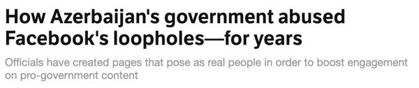 在阿塞拜疆,执政党叶尼·阿兹贝里恩(Yeni Azərbaycan)在2019年编造了数千种不实信息来骚扰反对派;