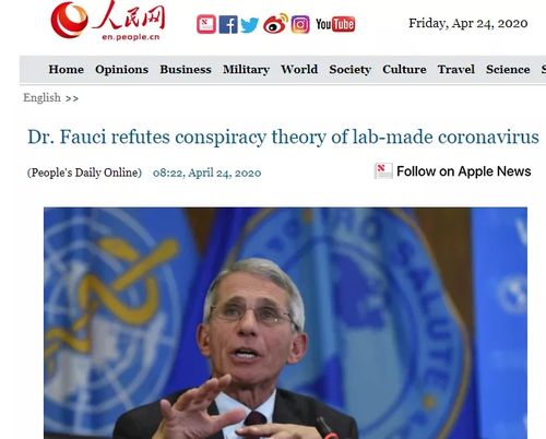 不少中国的媒体也在当时积极报道了福奇的言论,称福奇批驳了病毒是实验室制造的阴谋论。这些报道还令福奇在中国赢得了不少尊重。毕竟,他的说法等于是打脸了他的特朗普和蓬佩奥等“权贵”。