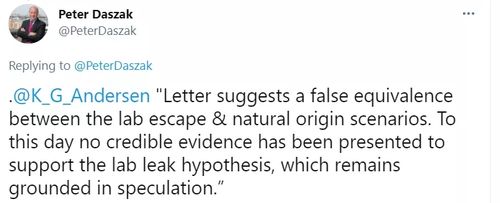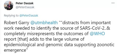 而且,达萨克近日还专门发帖抨击了巴里克签署的那封要求“调查”武汉病毒所的公开信,称他和那些来武汉进行溯源研究的学者已经发布了大量且充分的资料证明了病毒最有可能来自自然界,来自实验室的可能性则几乎不存在,他无法理解为何这封信会选择性忽视这些丰富的证据和数据。