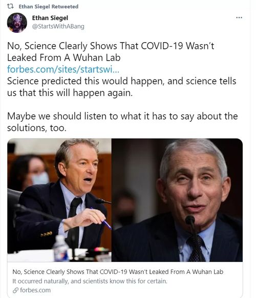 另外,一些美国的科学媒体人也在努力驳斥着病毒来自武汉实验室的这种阴谋论。比如美国科普作者Ethan Siegel就在一篇刊登在美国福布斯新闻网上的文章里表示,详细阐述了为何新冠病毒不可能是武汉实验室制造或泄露出来的,为何更可能来自自然界,并驳斥了许多虚假的阴谋论。