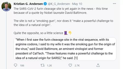 当时,巴尔的摩宣称新冠病毒很可能不是来自自然界,理由是新冠病毒基因序列中的一个蛋白点位并不是自然界中会存在的。但安德森却用详细的数据证明了大自然界中的冠状病毒里是存在这种蛋白点位的,有力地驳斥了巴尔的摩的说法。