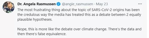 如下图所示,拉斯姆森昨天还在发帖,称媒体将新冠病毒来自“实验室泄露”的阴谋论当成需要“认真对待”的研究方向,就好比在气候变化的议题中,将“气候变化并不存在”这种谣言当成是一种应该被“认真对待”的学说一样荒诞。