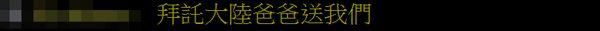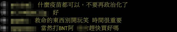 也有网友在PTT论坛发表文章“集气!想打BNT疫苗的朋友推爆吧!”随即涌入大批网友支持并留言:“救命的东西别开玩笑,时间很重要”,“拜托大陆爸爸送我们”,“拜托放下意识形态,买疫苗吧,家中还有年长父母呀”。↓