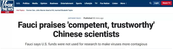 “这是没有办法保证的,”福奇回答说,“但在我们与接受资助者接触的经验中,包括中国接受资助者......他们都是非常有能力且值得信赖的科学家。”