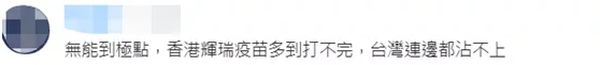 还有网友忍不住开骂民进党当局:无能到极点,香港疫苗多到打不完,台湾连边都沾不上;台湾人想打却没得打,香港却是多到要过期,我们“政府”是在睡觉吗?↓