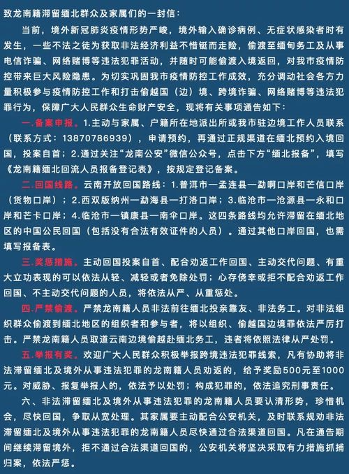 5月25日,江西省龙南市公安局发布《致龙南籍滞留缅北群众及家属们的一封信》,信中写道,当前,境外新冠肺炎疫情形势严峻,一些不法之徒为获取非法经济利益不惜铤而走险,偷渡至缅甸务工及从事电信诈骗、网络赌博等违法犯罪活动,并随时可能偷渡入境返回,对龙南市疫情防控带来巨大风险隐患。