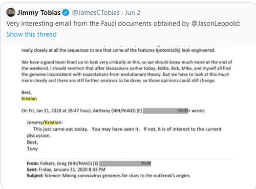 然而,他在去年2月1日写给福奇的那封邮件,近日却被一些美国媒体披露了出来。同时被这些美国媒体披露的,还有大量福奇与许多科学家的邮件往来。