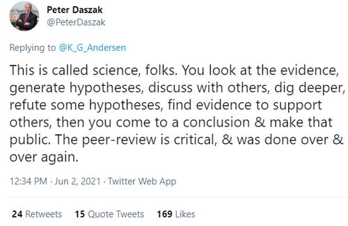让人敬佩的是,安德森再次站了出来,在他的个人社交账号上发帖说道:“就像之前多次讲过的那样,我们曾经认真地考虑过病毒来自实验室的可能性。但是,重要的新数据,大量的分析以及许多的探讨让我们最后得出了我们论文中(新冠病毒来自自然界)的结论。”