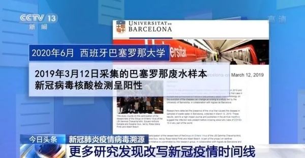 西班牙巴塞罗那大学去年6月发布公报说,该校的一个研究小组发现2019年3月12日采集的废水样本新冠病毒核酸检测呈阳性,不过病毒水平非常低。这意味着新冠病毒可能当时已在巴塞罗那存在,该时间点要比全球报告首例新冠确诊病例的时间提前很多。