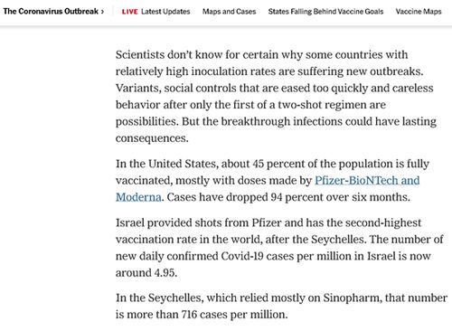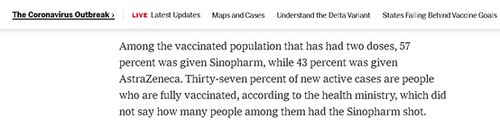 (截图来自《纽约时报》记者黄瑞黎今年5月撰写的另一篇抹黑中国疫苗的文章,其中提到塞舌尔其实除了中国疫苗还在打阿斯利康疫苗)