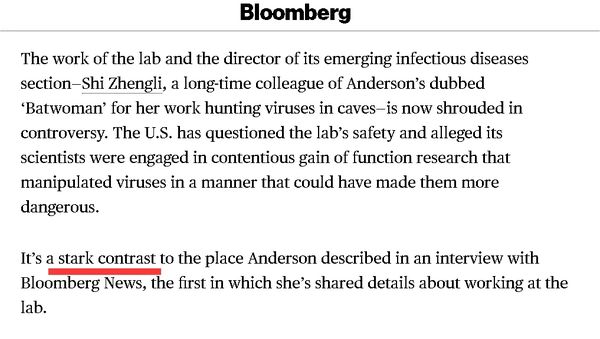 实际上,就连彭博社这篇采访了曾在武汉病毒所工作的澳籍科学家安德森,并呈现了她的说法的文章,也仍然被该报的编辑记者加入了不少宣扬那些抹黑武汉病毒所的阴谋论,或给这种阴谋论增添“合理性”的段落。