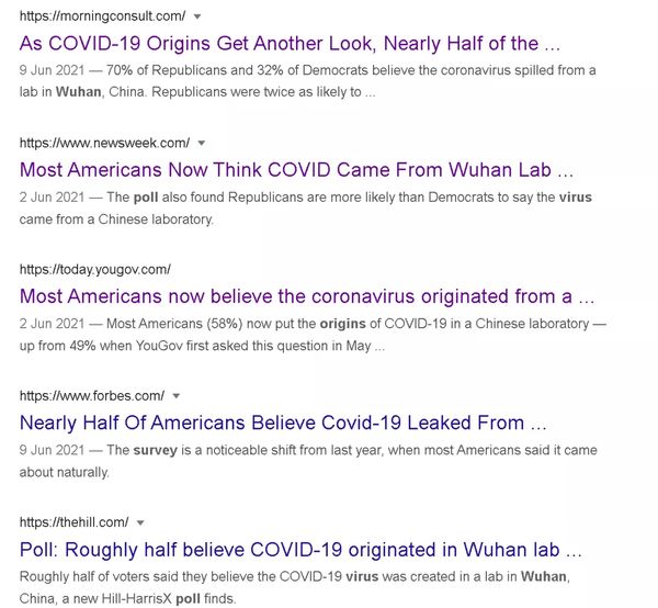 所以,即便这些良心科学家一直在发声,今年6月初美国多家民调机构发布的民意调查结果,却不约而同地显示,美国不仅有近半数的人认为新冠病毒“来自武汉病毒所”,而且持这种观点的人群,还远远超过不认可这种观点的人群。