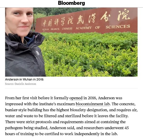 因此,在彭博社这样的西方媒体看来,安德森的这些工作背景,尤其是她在2019年下半年疫情暴发前夕这个时间节点在武汉病毒所工作过的经历,就令她的身份相当特殊了。