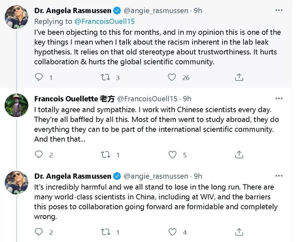 他的这番感慨,引起了一直在为中国武汉病毒所澄清阴谋论的加拿大病毒学家拉斯姆森的关注和回应。拉斯姆森认为这其实反映出了一种针对中国科研人员的种族主义,她还认为攻击武汉病毒所的“实验室泄露论”本身就是一种种族主义的体现。