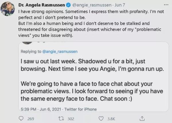 其他一些没有来武汉进行研究,但也很有良知的科学家,比如加拿大病毒学家安吉拉·拉斯姆森,也因为在网络上不断驳斥着污蔑武汉病毒所的阴谋论,遭到了直接的人身威胁,以至于她同样报了警。