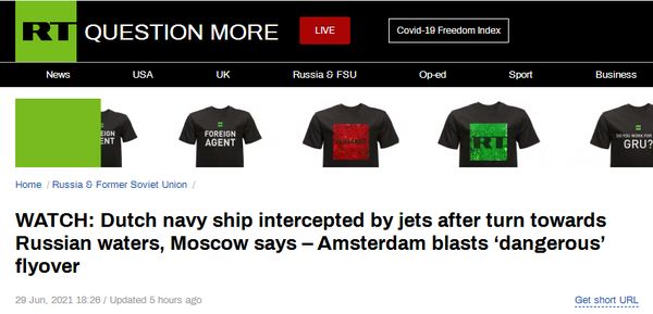 RT:莫斯科称,荷兰海军舰艇转向俄罗斯水域后遭(俄罗斯)喷气机驱离——阿姆斯特丹猛烈抨击(俄方)“危险”飞越