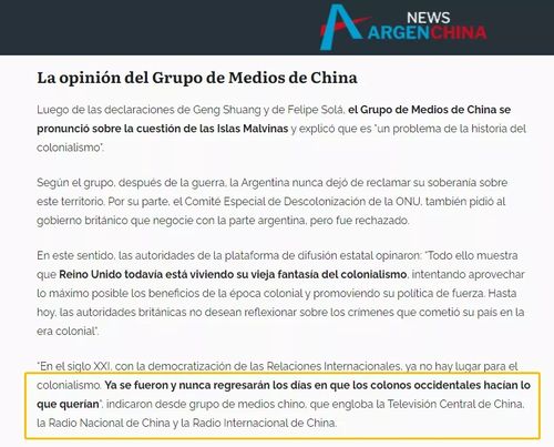 阿根廷媒体还专门引用了总台针对此事的报道:英国依然沉迷于殖民主义的旧梦当中,昔日西方殖民者为所欲为的日子已经一去不复返了。