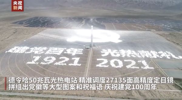 同期,由中控太阳能公司作为技术提供方参与建设的中电建青海共和50兆瓦光热电站拼组出“热烈庆祝中国共产党建党100周年”以及党徽等大型字样和图案,为中国共产党送上真挚祝福!