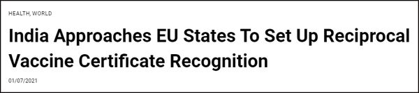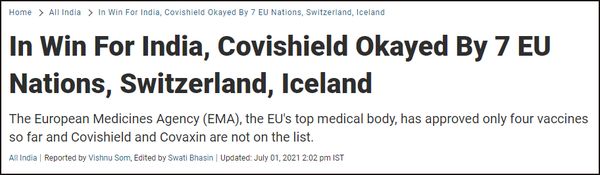 7月1日,BBC从消息人士处得到消息,奥地利、德国、斯洛文尼亚、希腊、爱尔兰和西班牙已批准,接种印度Covishield的旅行者被纳入欧盟“绿色通道”(green pass),可以在区域内自由通行。