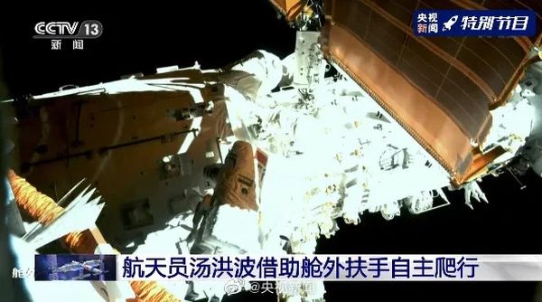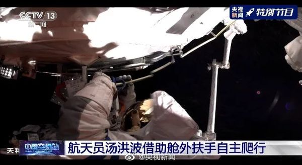 出舱期间,航天员汤洪波借助舱外扶手自主爬行,刘伯明和汤洪波舱外互相挥手。