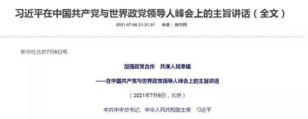 习近平出席中国共产党与世界政党领导人峰会并发表主旨讲话