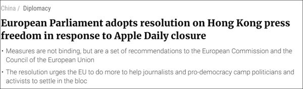 当天,欧洲议会以578票赞成、29票反对和73票弃权通过了这项动议。根据其官网发布的新闻稿,欧洲议会声称要以“最强烈的措辞”谴责“《苹果日报》关停并继续冻结其资产、逮捕其记者的行为”,其议员还妄称,“这是中国内地破坏香港自由社会、新闻自由、言论自由的又一举措”。